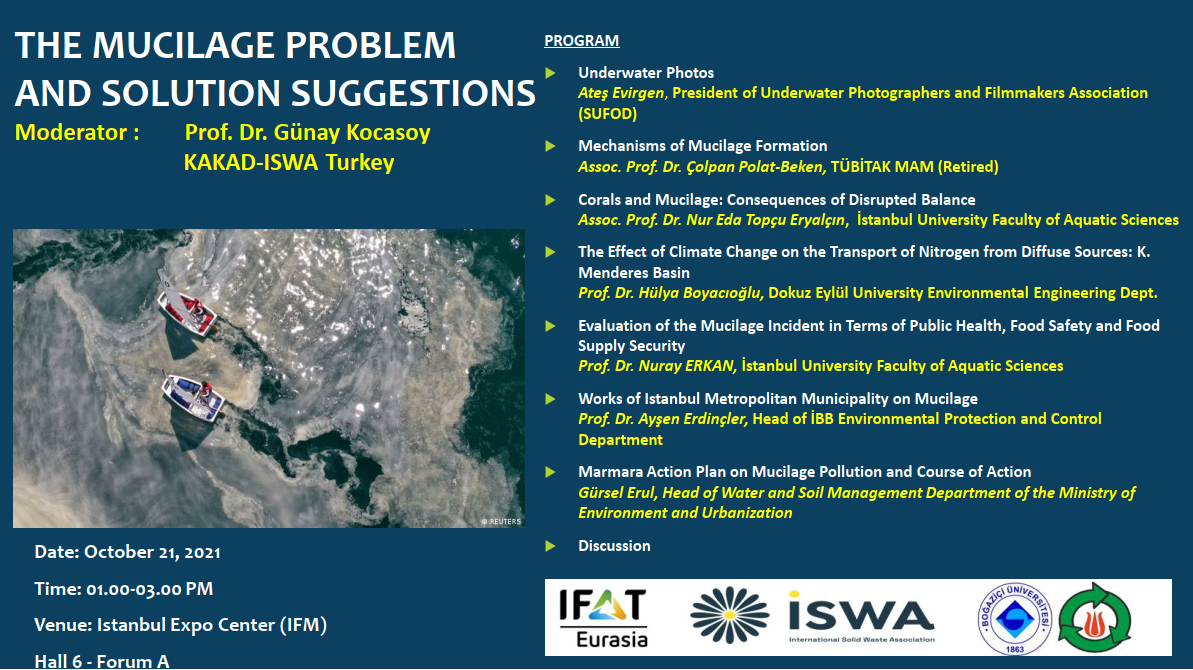 IFAT Eurasia SMM 2021 Fair: “MUSILAGE PROBLEM AND SOLUTION SUGGESTIONS PANEL” was organized by the Turkish National Committee for Solid Wastes (KAKAD-ISWA TURKEY) and the International Solid Waste Association (ISWA International Solid Waste Association) on October 21, 2021 at the Istanbul Expo Center between 13:00 and 15:00.